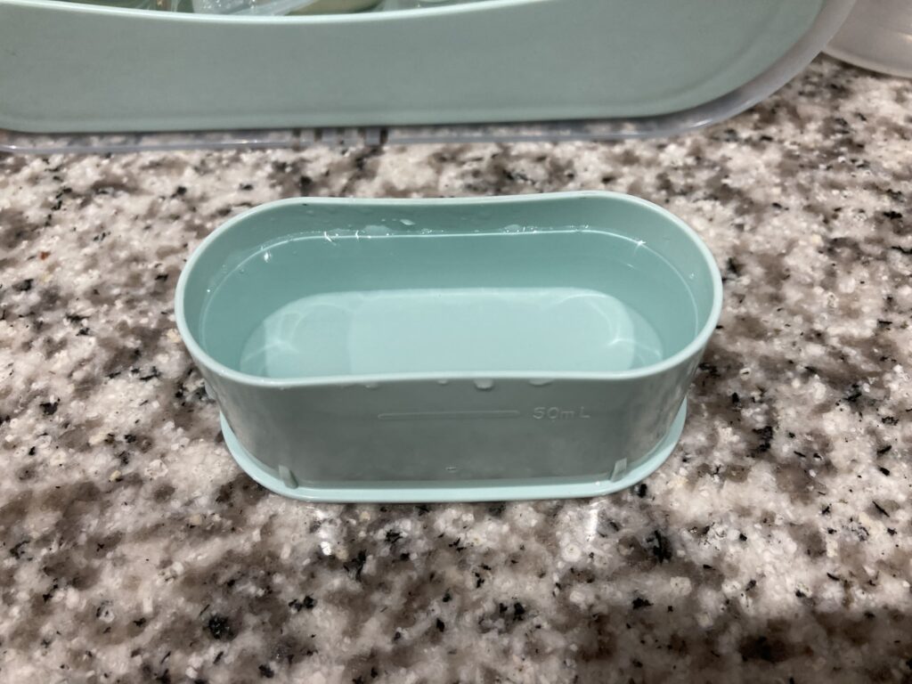 蓋をして電子レンジに入れ、500W5分で加熱し、消毒完了です。